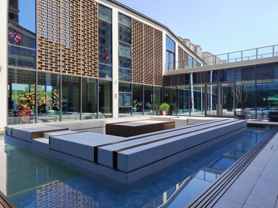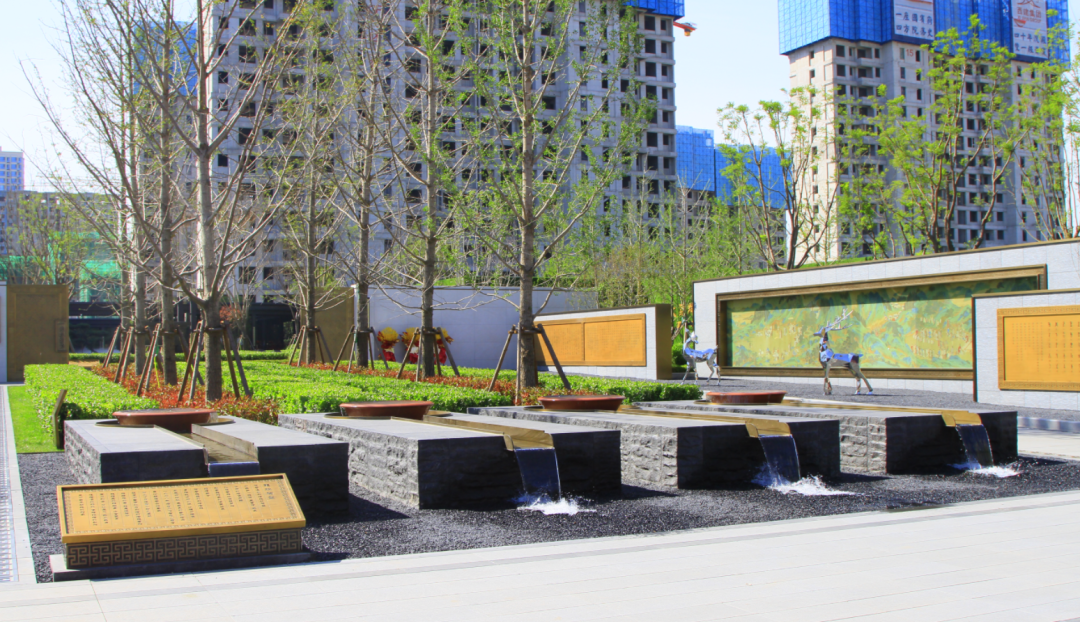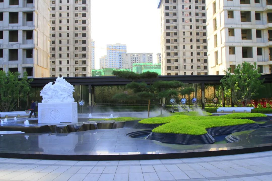 坐落在歷史景觀長軸與和軸的十字交叉點,水景以黑金砂鋪設(shè),呈現(xiàn)出“和”字樣式,池底為景泰藍石材,與周邊不銹鋼流水缽、漢白玉玉璽、造型迎客松等連成一體;從高空俯瞰看,它像是印章一樣印在我們國賓府的中心,寓意國賓府業(yè)主家和萬事興。