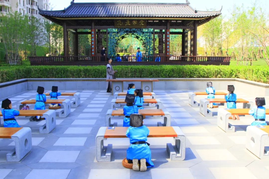 踏入學(xué)堂走到書案,映入眼簾是勸學(xué)和中庸的書卷雕塑,隔岸可以看到孔孟學(xué)堂亭,整個氛圍猶如“孔子講學(xué)”的場景。表達了西建國賓府對小業(yè)主們長大成龍成鳳的美好愿景。